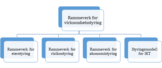 Rammeverk for virksomhetsstyring angir prinsippene for virksomhetsstyring og er det overordnede rammeverket for styring og kontroll for foretaksgruppen i Helse Midt-Norge. Flere av de ulike områdene som omtales i rammeverk for virksomhetsstyring er beskrevet i større detalj i egne dokumenter som henger sammen med rammeverket.