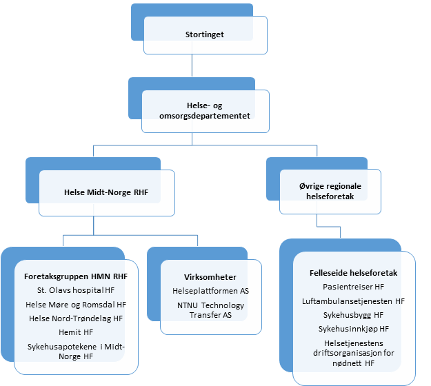 Helseforetakene er selvstendige rettssubjekter. Av dette følger det at helseforetakene har et selvstendig ansvar for å levere forsvarlige tjenester og følge opp alle lovkrav som gjelder for virksomheten, samt følge opp uønskede hendelser og avvik. Det enkelte helseforetak har et selvstendig ansvar for en hensiktsmessig organisering, for å etablere god virksomhetsstyring og for at styringssystemet er tilpasset helseforetakets egenart og særskilte risikoforhold.