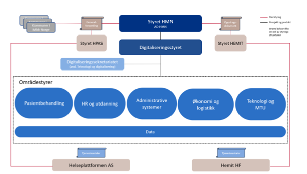 Formålet med styringsstrukturen er å sikre at IT-løsningene som er og vil bli anskaffet innføres, utvikles og forvaltes nært kundene (brukerne) og deres behov. IT-drift og forvaltning gjennomføres og organiseres gjennom Hemit HF og Helseplattformen AS. Selskapene har gjennom sine vedtekter, oppdragsdokumenter og tjenesteavtaler fått definert sin rolle og sine oppgaver innenfor den samlede IT-styringen i regionen.