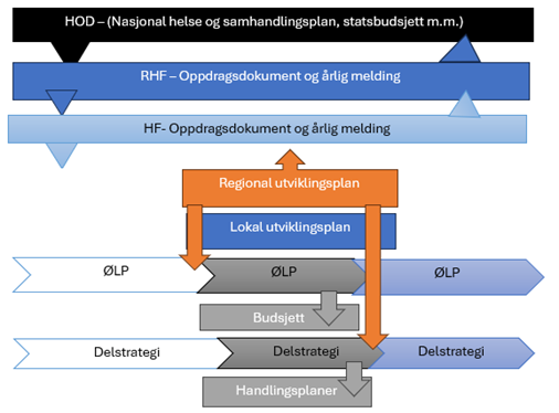 Nasjonal helse- og samhandlingsplan beskriver politiske føringer, ambisjoner og planer for utviklingen av helsetjenesten. Gjennom regional utviklingsplan følger Helse Midt-Norge RHF opp forventingene uttrykt i nasjonalt planverk, og beskriver de overordnede føringer for utviklingen i regionen.